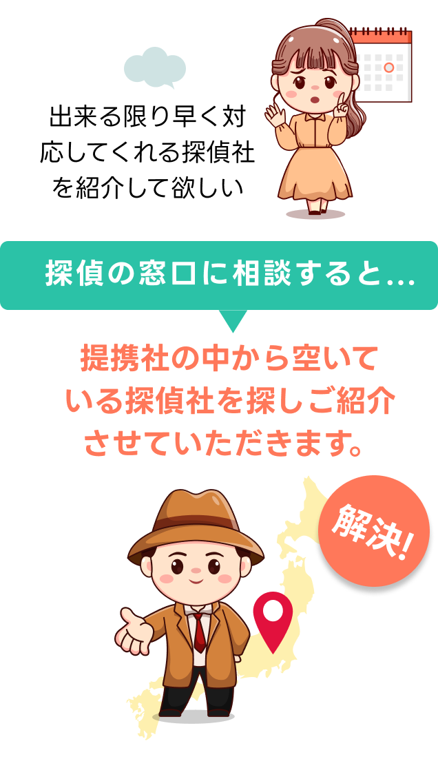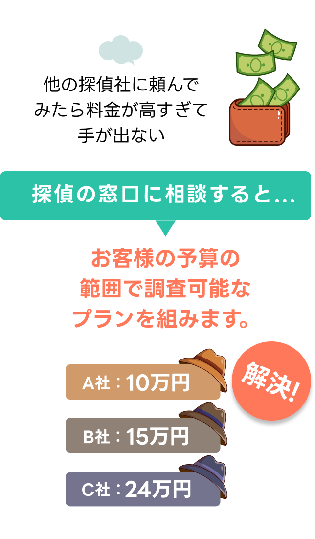 「探偵の探し方がわからない」「既に他の探偵社に頼んでみたけど高かった」「明日調査できるところを探したい」