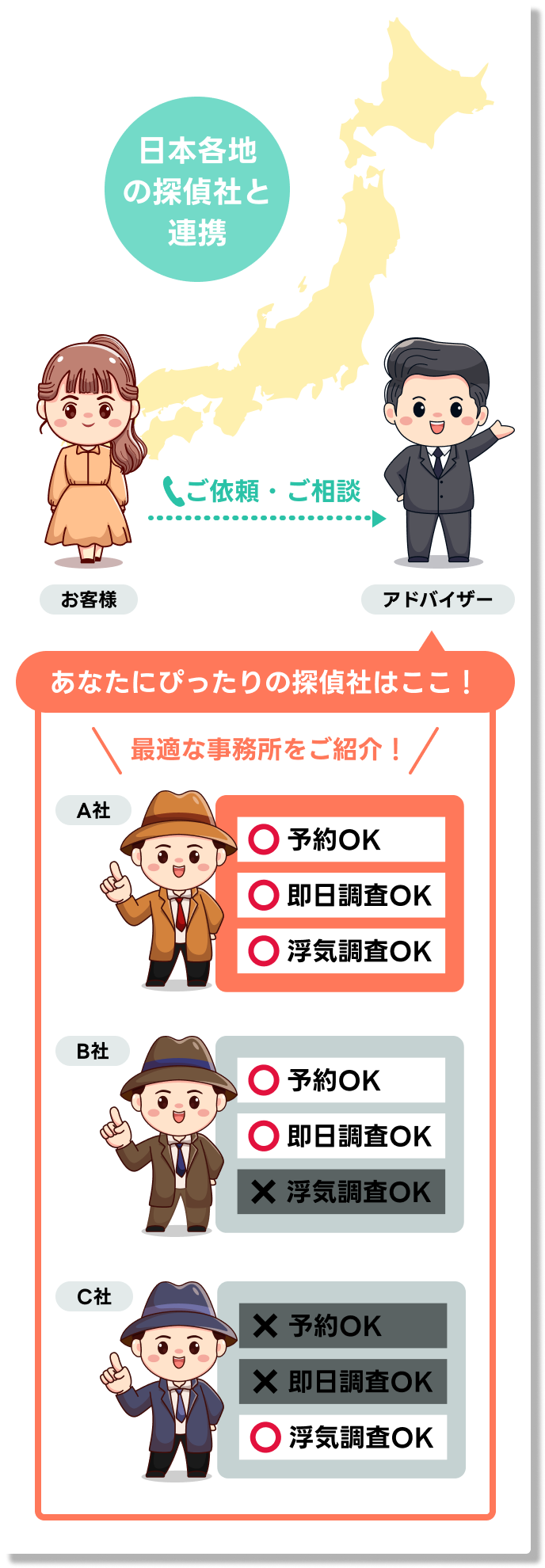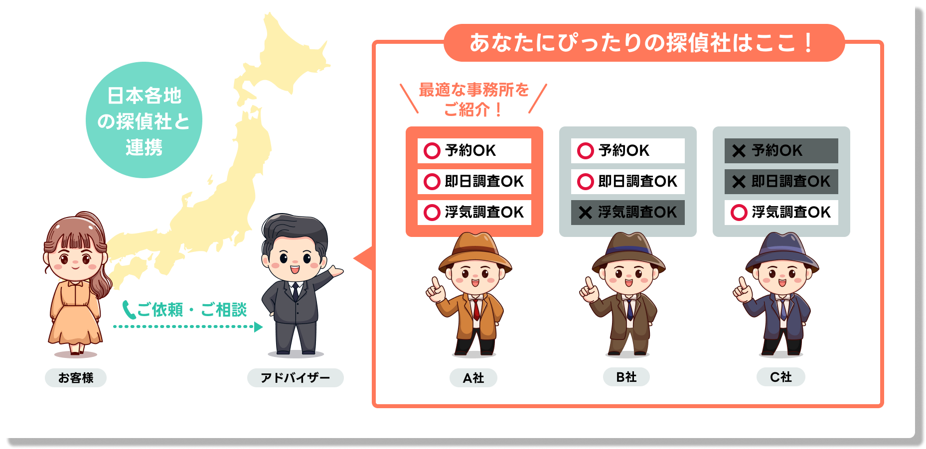 当社アドバイザーがあなたの相談を受け、探偵事務所や調査プランをご紹介させていただきます。